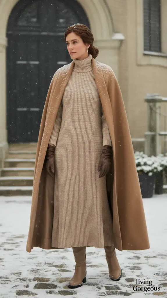 A wool cape adds an extra layer that feels graceful and protective. Its drape and movement bring quiet beauty without being dramatic. Soft winter tones enhance the peaceful feel.