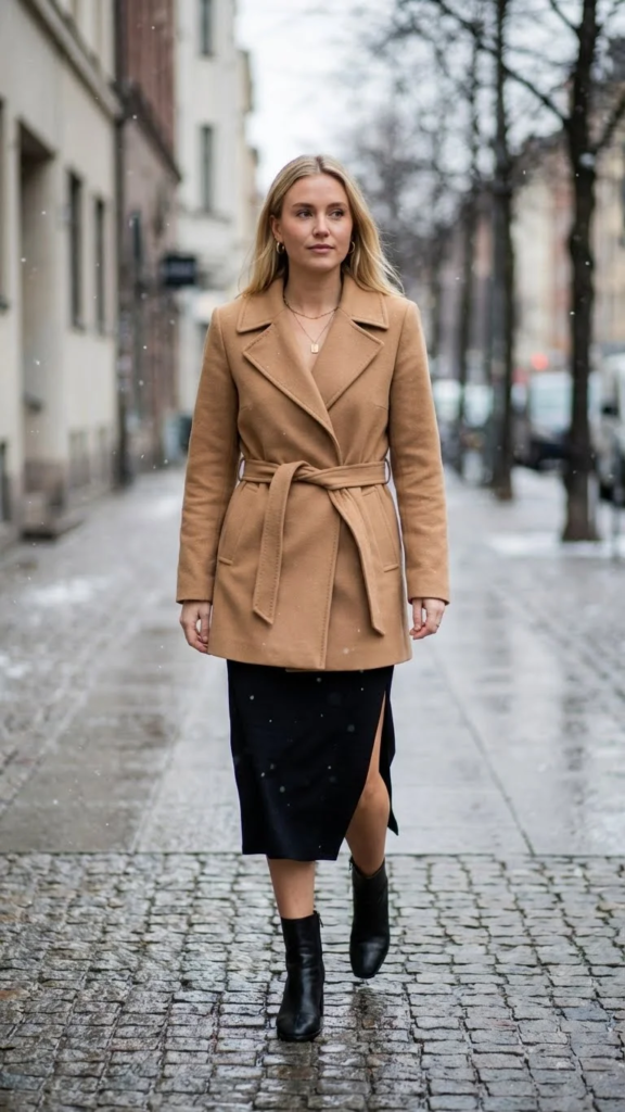 A belted trench coat paired with a slit black skirt creates a sharp winter outfit. The coat adds structure while the skirt allows easy movement. This pairing feels balanced and practical.