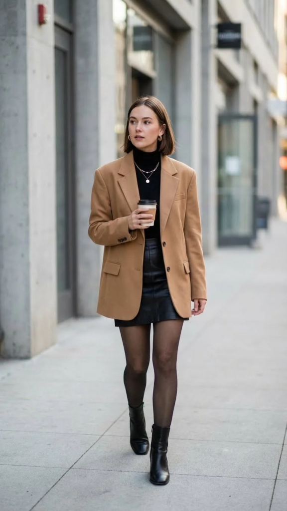 An oversized blazer with a mini black skirt blends comfort with structure. The loose blazer adds warmth, while the short skirt keeps the look stylish. This mix feels modern and easy to wear.