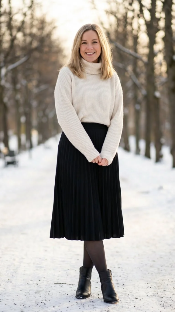 A fitted turtleneck in ribbed or knit fabric adds warmth without bulk. A high-waisted pleated skirt helps define your shape and adds movement. The pleats give the outfit a soft and flowing look.