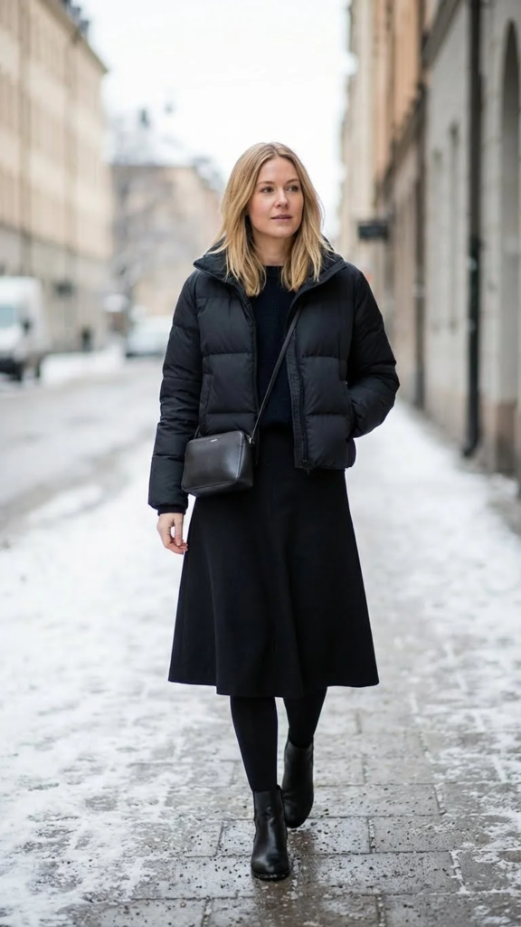 A cropped puffer jacket with an A-line black skirt creates a warm and flattering outfit. The short jacket highlights the waist, while the skirt flows gently below. This balance keeps the outfit comfortable and stylish.