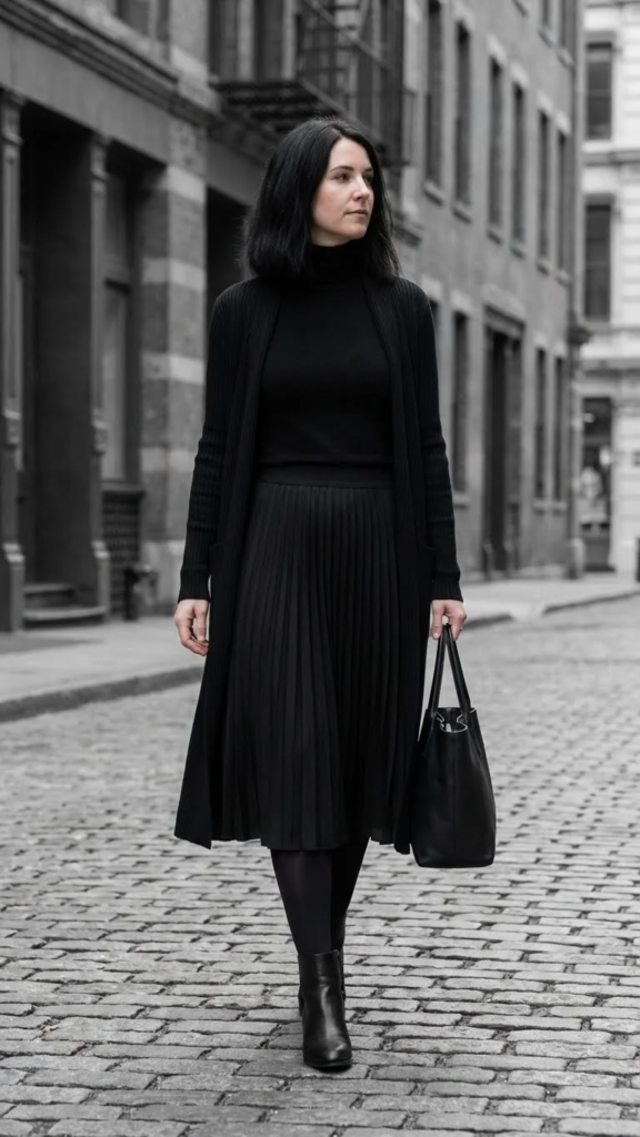 Using different textures like knit, wool, or leather keeps the outfit interesting. A black turtleneck with a cardigan or blazer adds layers without extra color. This keeps everything balanced.