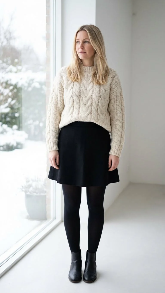 A textured wool sweater with opaque tights creates a warm winter base. This pairing keeps you comfortable while still looking neat. It works well with a black skirt of any length.