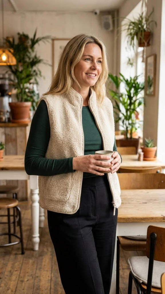 Choosing a fitted long-sleeve top keeps the look clean. Neutral colors help the vest stand out. The vest keeps your core warm while your arms stay free.