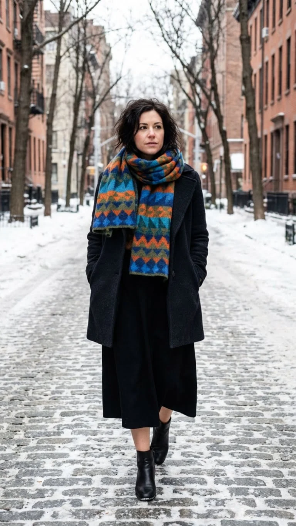 A statement scarf can change a black skirt outfit instantly. Bold patterns or textures add personality and warmth. It becomes the main focus of the look.