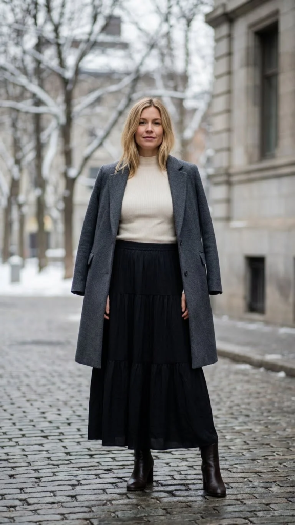 A fitted mock neck with a tiered black skirt creates a balanced winter look. The top keeps the shape clean while the skirt adds movement. This pairing feels polished and easy.