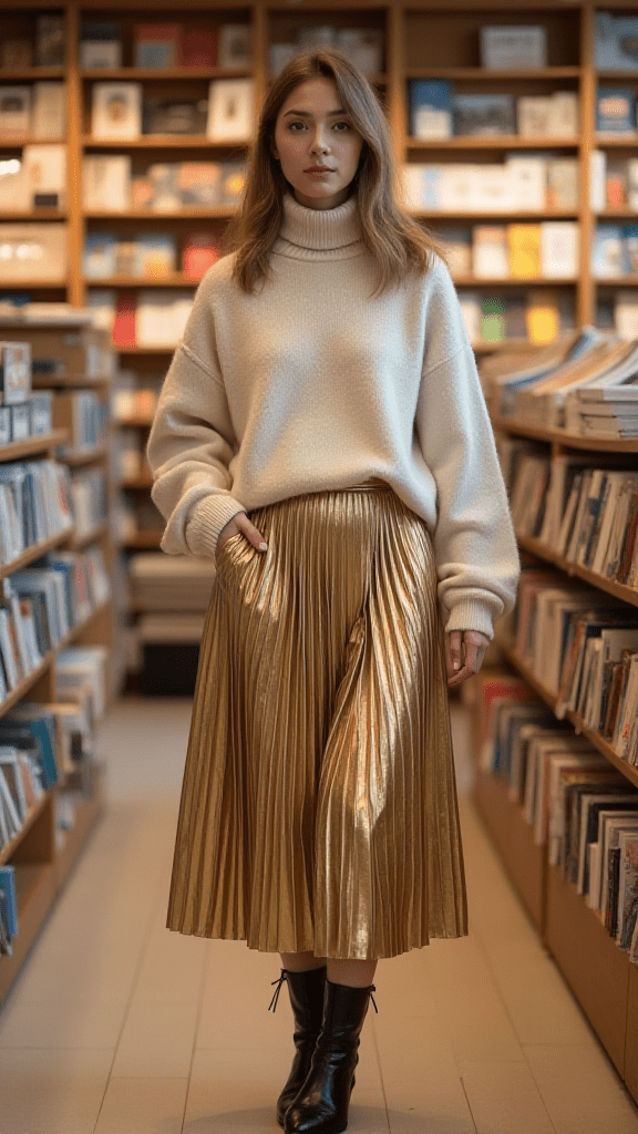 A metallic pleated midi skirt brings shine to cold-weather fashion. The pleats add movement and texture.