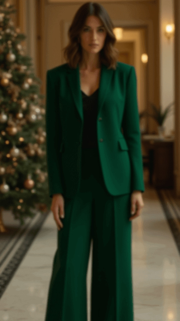 Jewel tones work well during winter and feel rich and festive. The suit keeps the outfit structured and polished.
