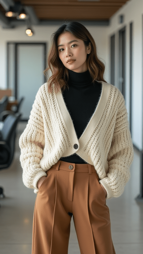 Layering two turtlenecks adds both warmth and style. Wearing a thinner turtleneck under a thicker one keeps you cozy while still looking fashionable. This outfit works well with wide-leg pants, giving a relaxed and retro feel.