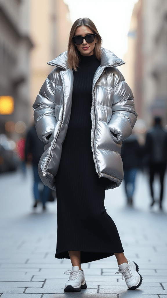 A puffer coat can be both warm and stylish when paired with a fitted midi dress. This outfit mixes a casual outer layer with a more polished piece underneath. Choosing a bold or shiny puffer adds personality to the look.