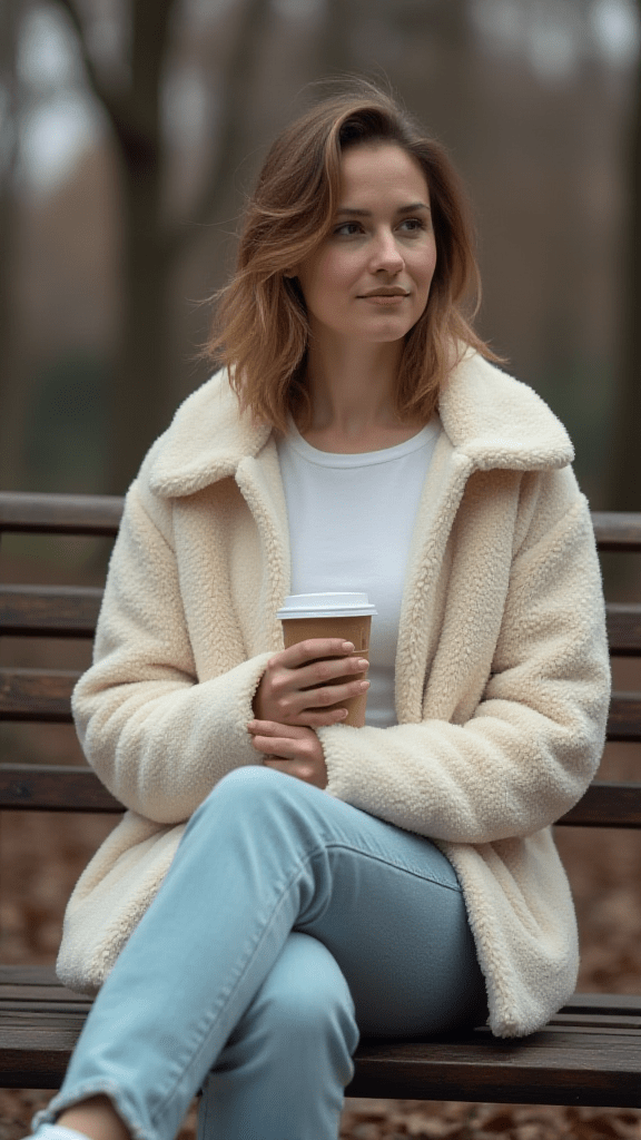 A teddy coat offers warmth and comfort with a soft texture. Pairing it with wide-leg jeans gives the outfit a relaxed, vintage-inspired feel that works well in winter.