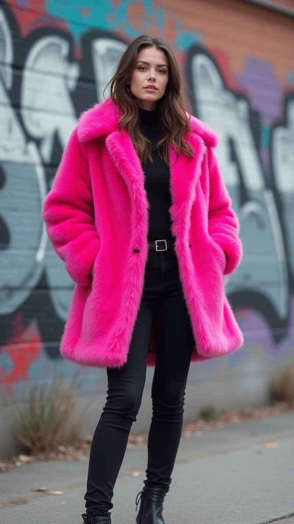 A bright faux fur coat brings color and fun to winter outfits. It stands out and adds personality, even on cold days. Keeping the rest of the outfit simple allows the coat to be the main focus.