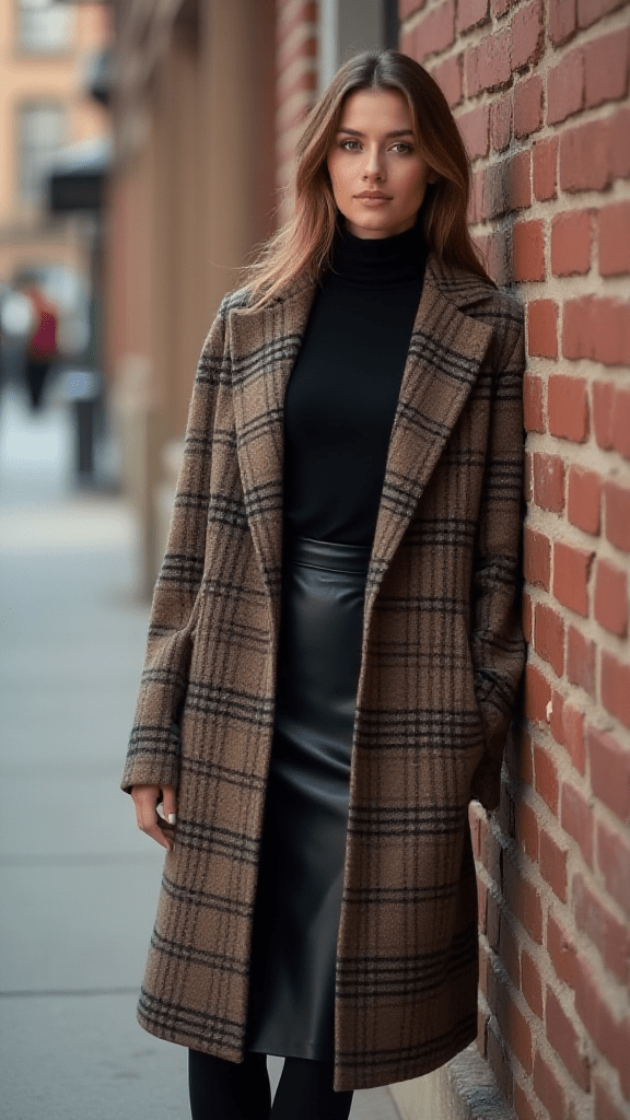 This outfit combines classic and edgy styles. A plaid blazer adds structure and a polished feel, while a leather skirt keeps the look bold. Together, they create a strong contrast.