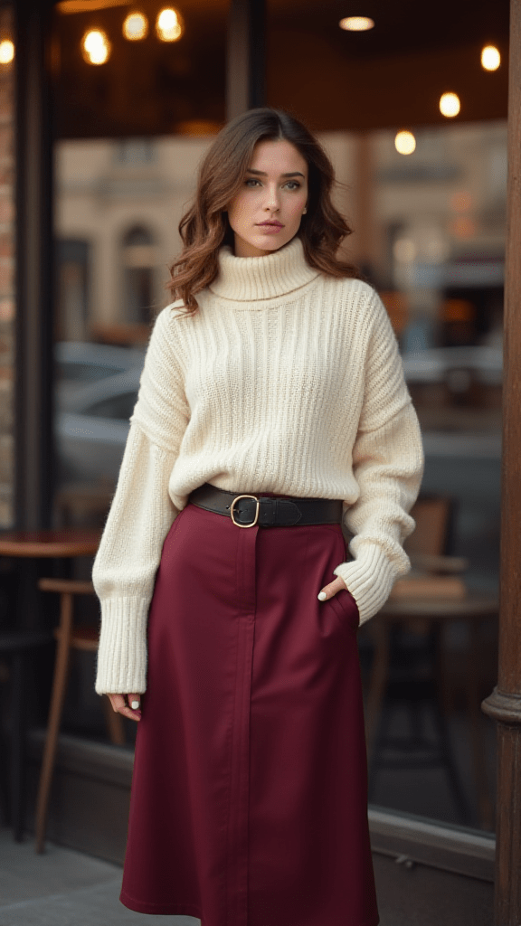 This outfit blends comfort with elegance. A thick turtleneck tucked into a flowing midi skirt creates a balanced winter look. It feels cozy on top and light on the bottom.