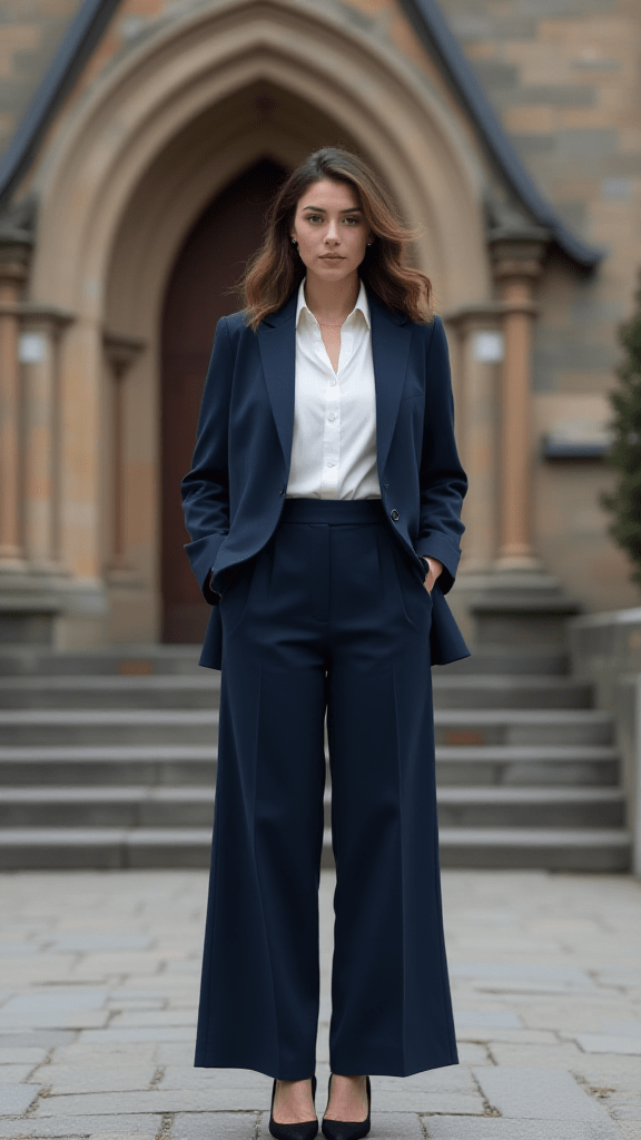 Choosing deeper colors like navy or burgundy helps the outfit feel rich and winter-appropriate. Wearing a silk blouse underneath adds softness and balance to the structured suit. Simple accessories like pearl earrings complete the look without making it feel overdone.