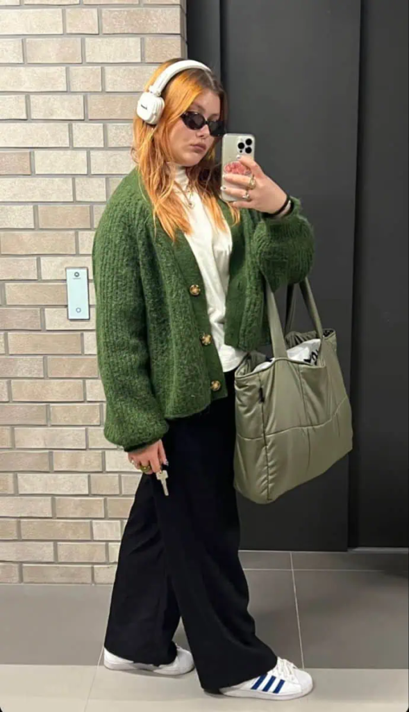 Black wide-leg trousers and white sneakers balance the bold cardigan and keep the outfit comfortable. A cream turtleneck softens the look, while an olive tote bag adds a calm neutral touch.