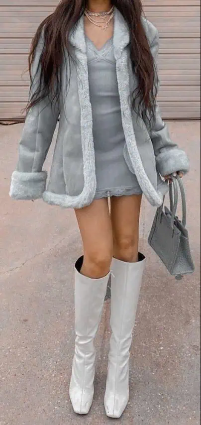 A matching mini dress underneath keeps the outfit smooth and simple. White knee-high boots add a bold and modern touch.