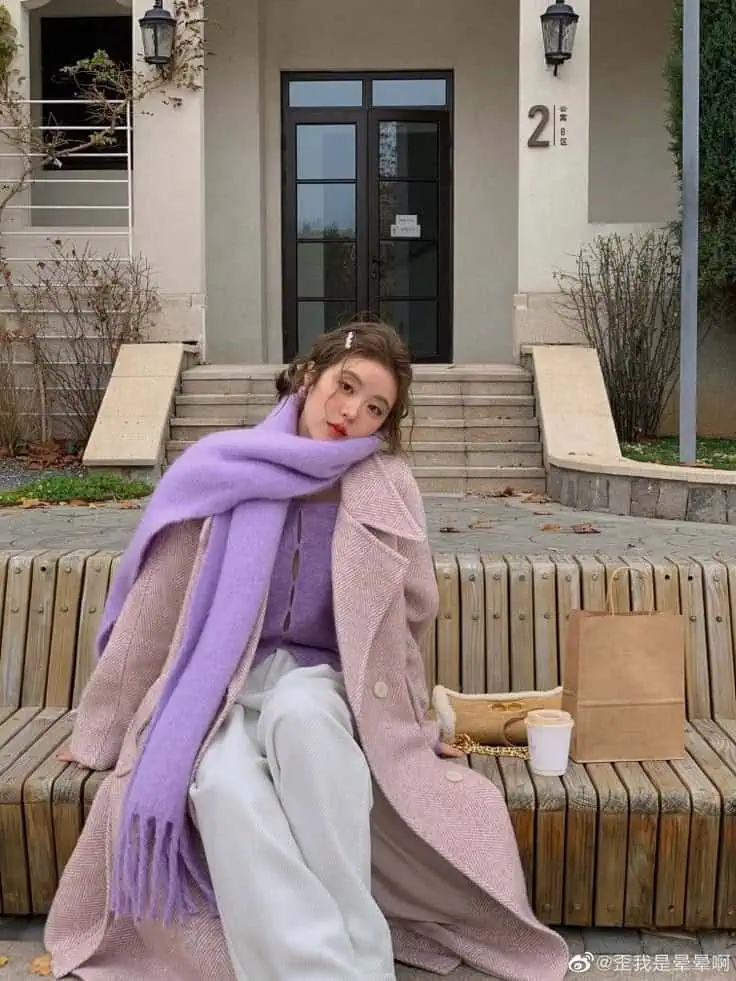 This look feels soft and calm. A fuzzy lavender sweater keeps you warm and comfortable during cooler days.
