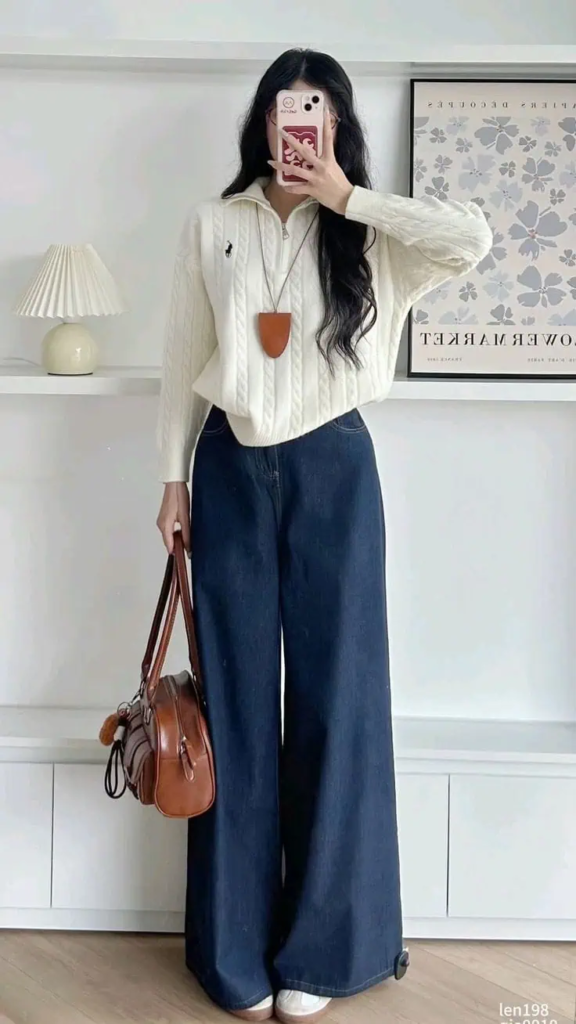 Wide-leg denim keeps the look relaxed. Together, they create balance between neat and casual.