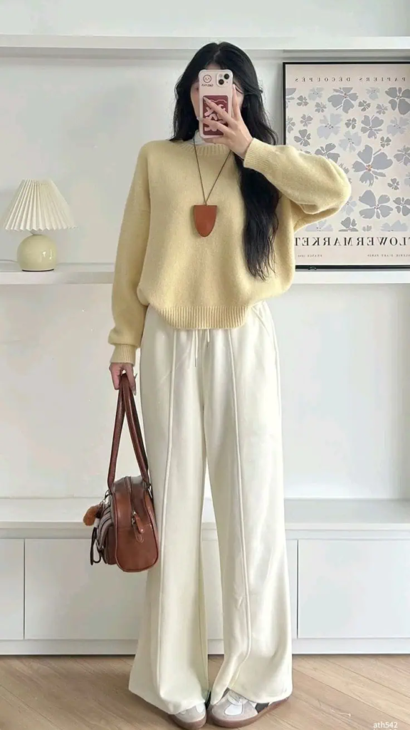 This outfit uses gentle colors. A soft yellow sweater pairs well with white wide-leg trousers.