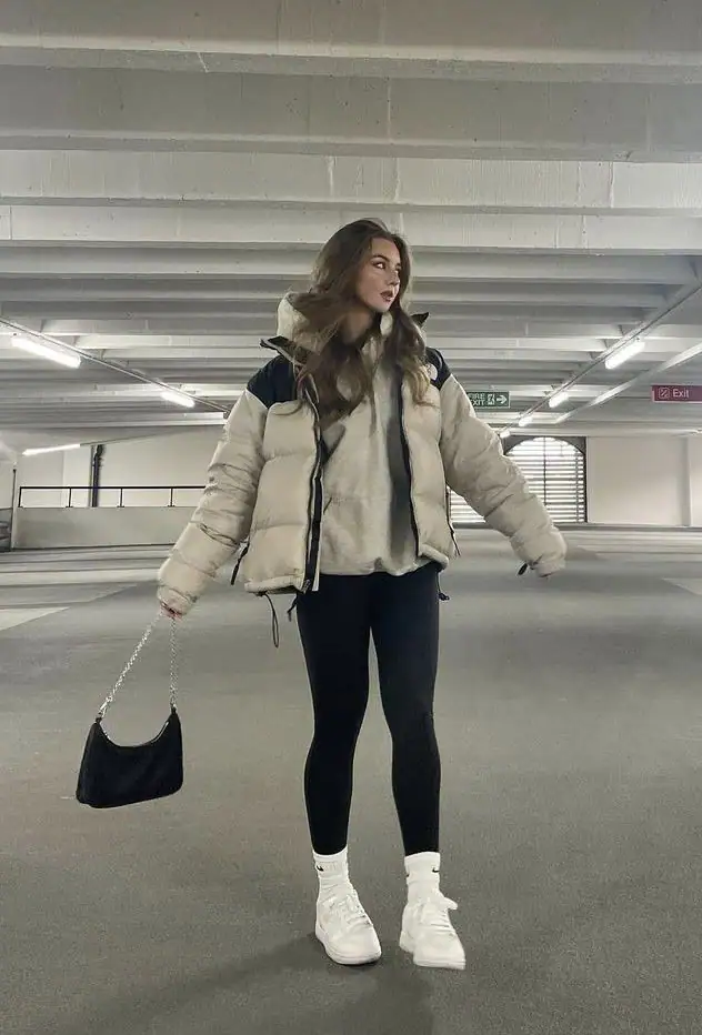 This winter outfit shows how black leggings can be the base for an easy and stylish look. The cream puffer jacket stands out against the black leggings, while white sneakers add a modern and sporty feel.