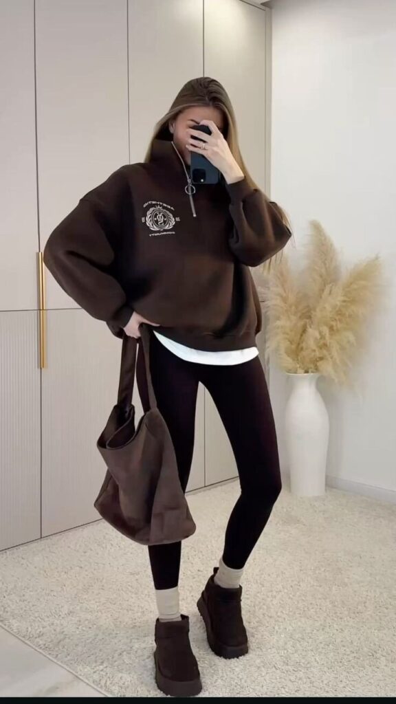 This winter outfit shows that black leggings are a versatile base for stylish seasonal looks. When paired with a chocolate-brown fleece half-zip pullover, the outfit feels comfortable while still looking modern.
