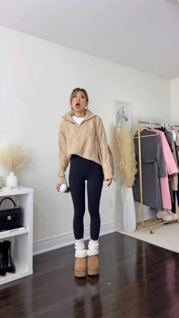 This winter outfit shows that black leggings are a flexible base for everyday comfort. Worn with an oversized beige knit sweater and white crew socks above tan boots, the look feels warm, relaxed, and stylish.