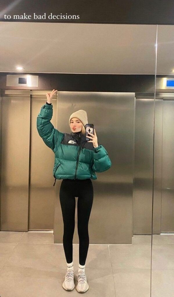 This winter athleisure outfit shows that black leggings are a strong base for layering. Worn with a large black puffer jacket and white sneakers, the look stays warm while still feeling stylish and comfortable.