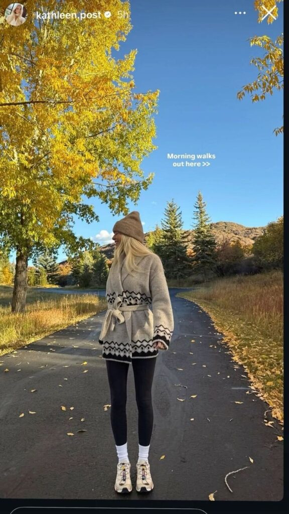 This autumn outfit shows that black leggings are a strong base for outdoor winter looks. Paired with an oversized patterned cardigan and a warm beanie, the outfit feels comfortable while still looking relaxed and stylish for walks and outdoor time.