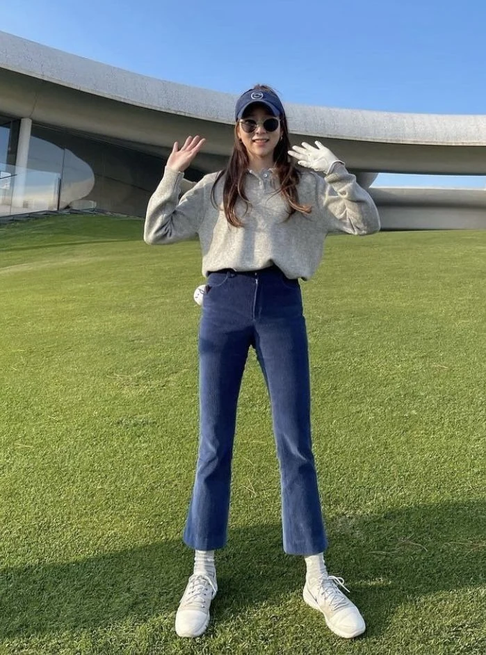 This stylish outfit shows that winter golf fashion can be both comfortable and fashionable. A soft, oversized cream knit sweater keeps you warm while still looking polished, and cropped denim jeans create a modern shape that flatters the legs.