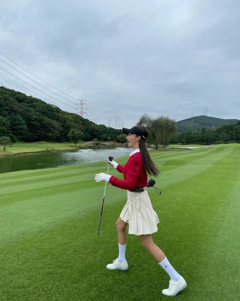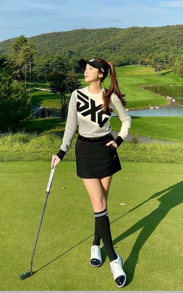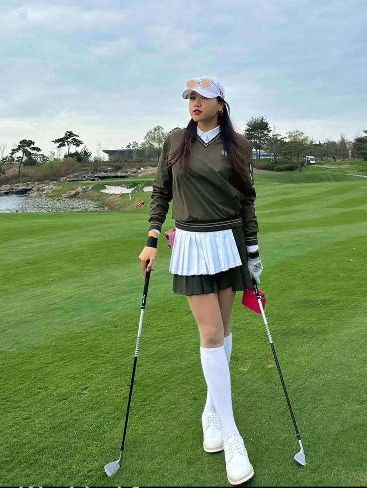 A pleated skirt in matching tones gives the outfit a neat, classic look while allowing free movement during the swing. White knee-high socks and white sneakers complete the outfit with comfort and a vintage golf feel.