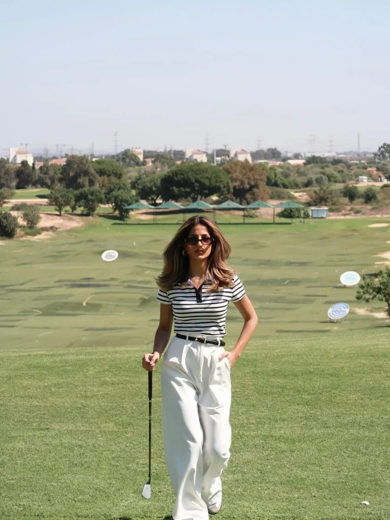 A lightweight sweater or cardigan can be added for extra warmth on colder days, making the outfit easy to adjust as temperatures change. The structured golf pants allow easy movement during the swing while keeping a polished shape, showing that golf fashion can be both useful and stylish.