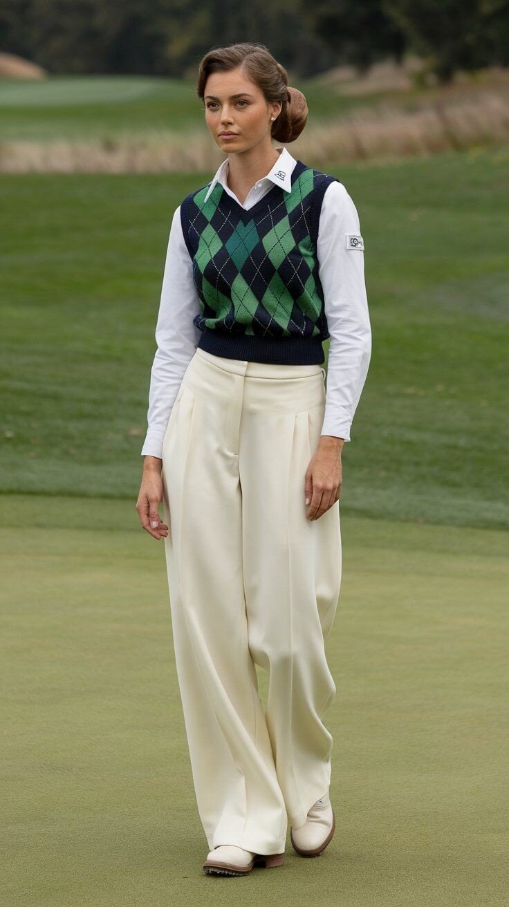 This classic outfit reflects preppy golf style while providing warmth for winter play. The navy and green argyle vest layered over a white collared shirt creates a neat and polished look that works well on the course.