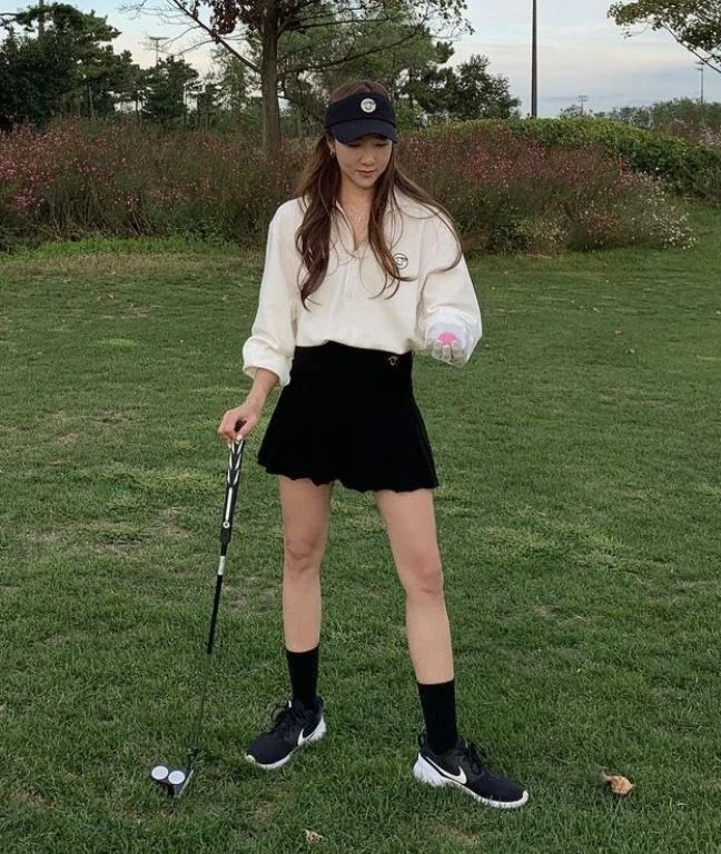 Paired with a pleated skirt, the outfit reflects timeless golf fashion. Tall black socks and white sneakers complete the look and help keep the legs warm during play.
