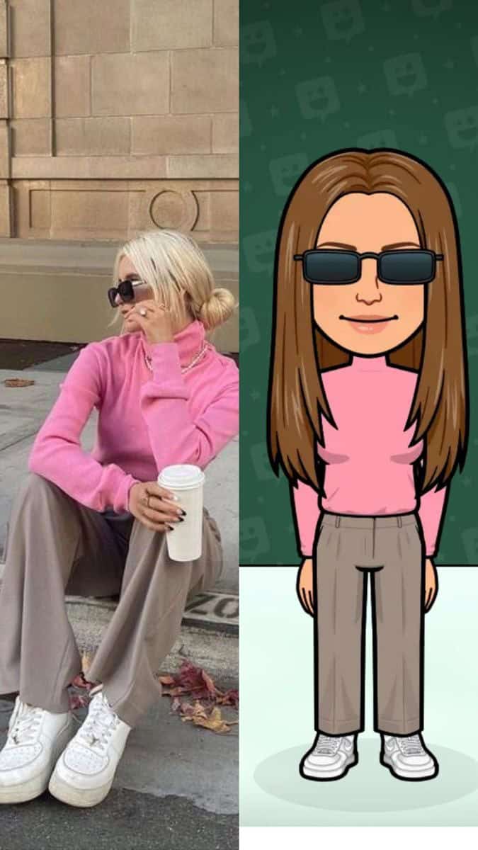 This Bitmoji outfit mixes cozy and chic style with a bright pink turtleneck and neutral pants that create a balanced, polished look. It’s great for cool fall days when you want to stand out while staying comfortable. Sleek sunglasses add a cool touch, making the outfit fit both casual moments and stylish virtual meetups. A trendy coffee cup finishes the fall vibe.