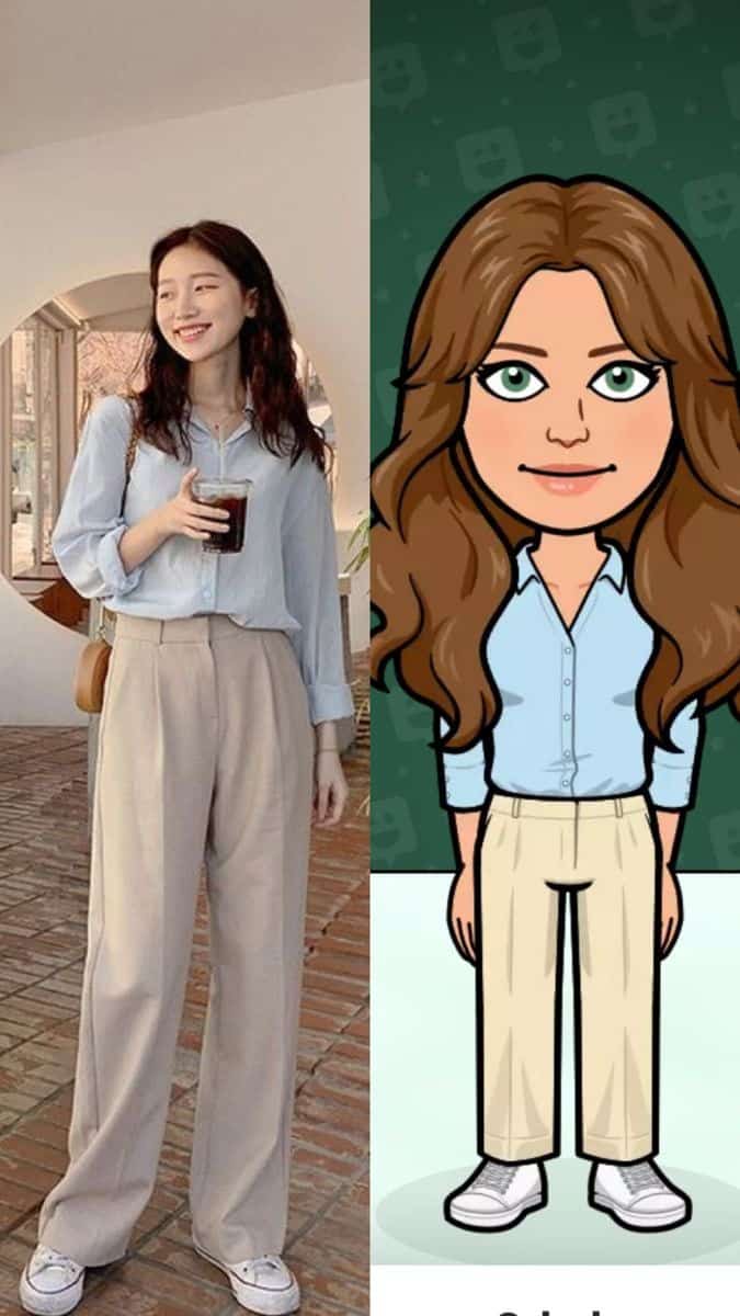 This Bitmoji outfit pairs a light blue button-down blouse with relaxed beige trousers for a mix of comfort and style. The soft colors bring to mind calm autumn skies, and the classic shape keeps the look on-trend. With white sneakers, the outfit adds a casual touch, making it a good choice for virtual work meetings or online coffee dates during the fall.
