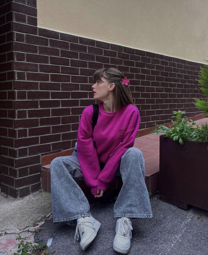This outfit shows that winter school clothes do not have to look boring. The bright magenta sweatshirt adds color and personality, while the relaxed blue jeans keep the look casual and comfortable. The oversized sweatshirt is perfect for staying cozy during long school days.