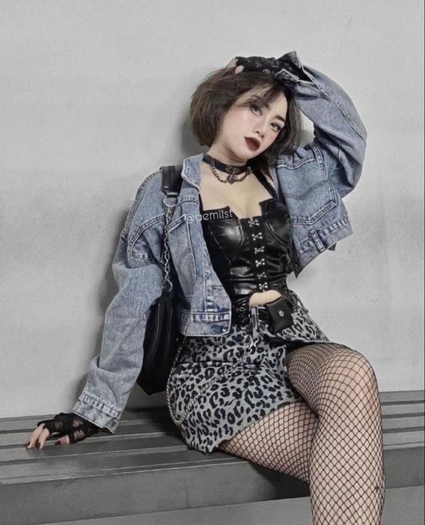 When I style clients for shows, I love pairing contrasting textures to create that authentic rock vibe. An oversized denim jacket with a structured black leather corset instantly builds a strong, rebellious silhouette. Adding a leopard print mini skirt and fishnet tights brings in extra texture and attitude, while simple black accessories and a choker help tie the whole look together.