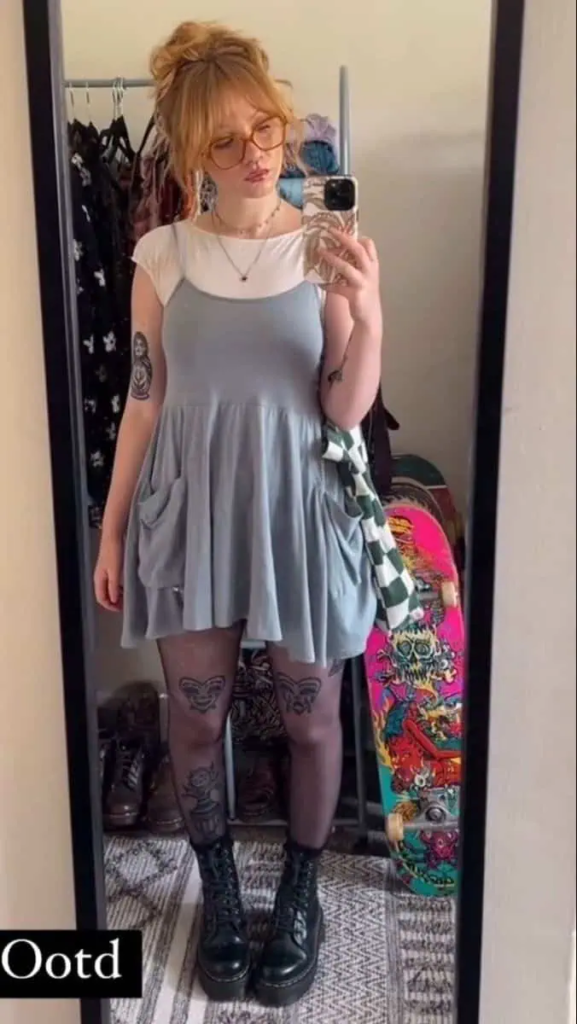 When I style clients for rock shows, I often suggest balancing feminine items with tougher details. A pale blue baby tee dress creates a light, relaxed base, while black lace-up combat boots instantly bring that rock attitude. Layering a simple white tee underneath adds depth, and touches like patterned tights or a delicate chain necklace give the outfit a bit of personality.