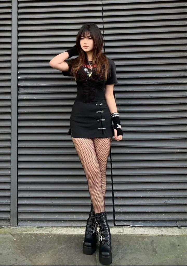 When I style clients for shows, I often recommend pieces like a mesh crop top with cutout details because it instantly adds that rebellious rock energy. The sheer fishnet sleeves bring texture and movement, and pairing it with a black mini skirt keeps the outfit balanced and easy to wear. Platform boots and sheer tights finish the look with the kind of attitude that fits perfectly in a concert crowd.