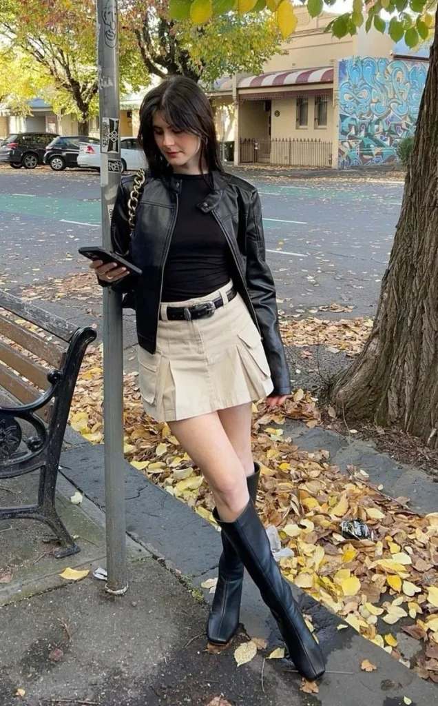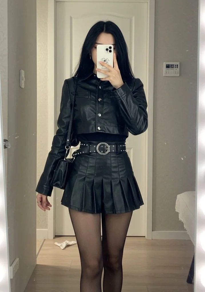 This outfit blends winter comfort with a strong concert style. The cropped black leather jacket keeps you warm while adding a bold, sharp edge, and the cream pleated mini skirt brings a fun, modern touch that lifts the whole look.