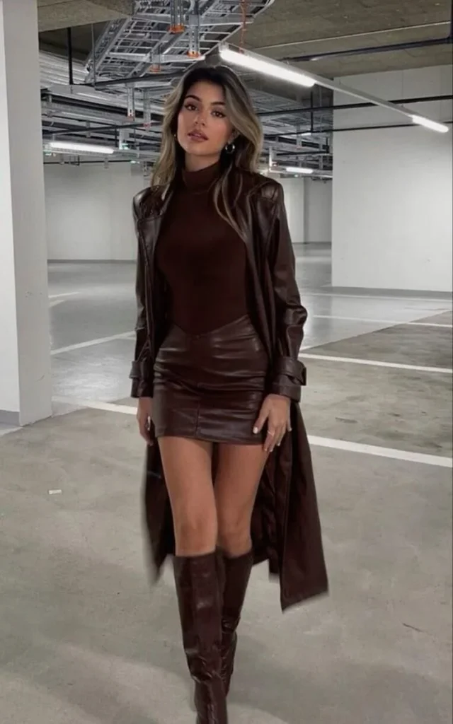 This all-brown leather outfit makes a bold winter concert statement while keeping you warm. The chocolate leather trench coat layered over a fitted turtleneck and matching leather mini skirt creates a smooth, unified look that feels sleek and confident.