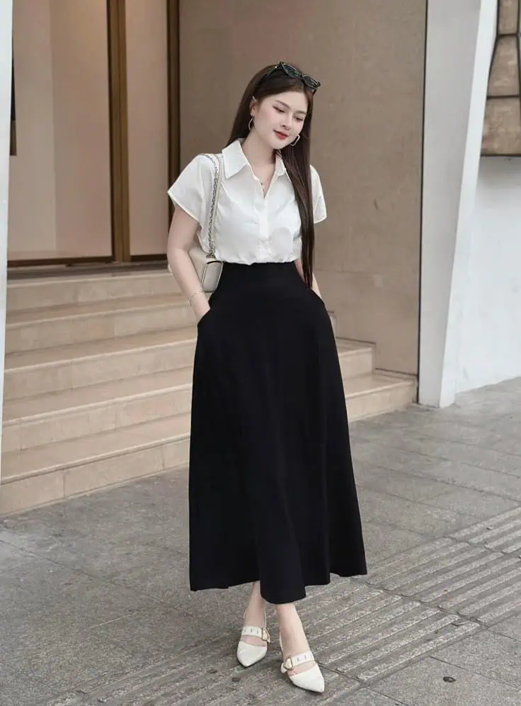 Black and white outfits always feel polished and reliable. A white short-sleeve blouse with a black maxi skirt creates a clean and balanced look.