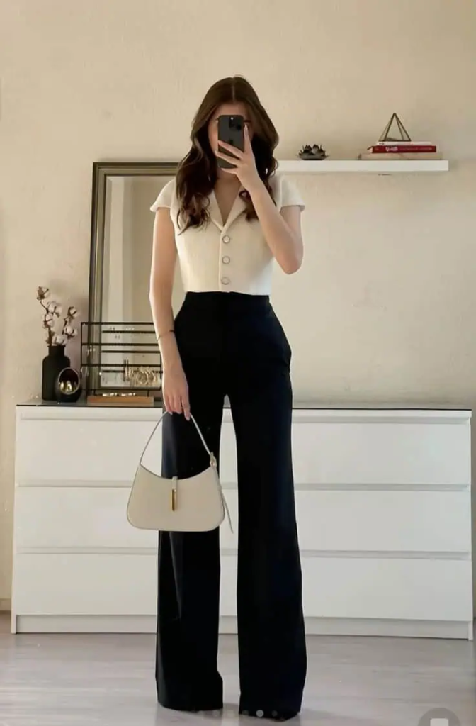 Black high-waisted trousers help create a long and confident silhouette. A neutral handbag ties the look together without making it feel too formal. This outfit shows how simple colors can still look sharp and stylish.