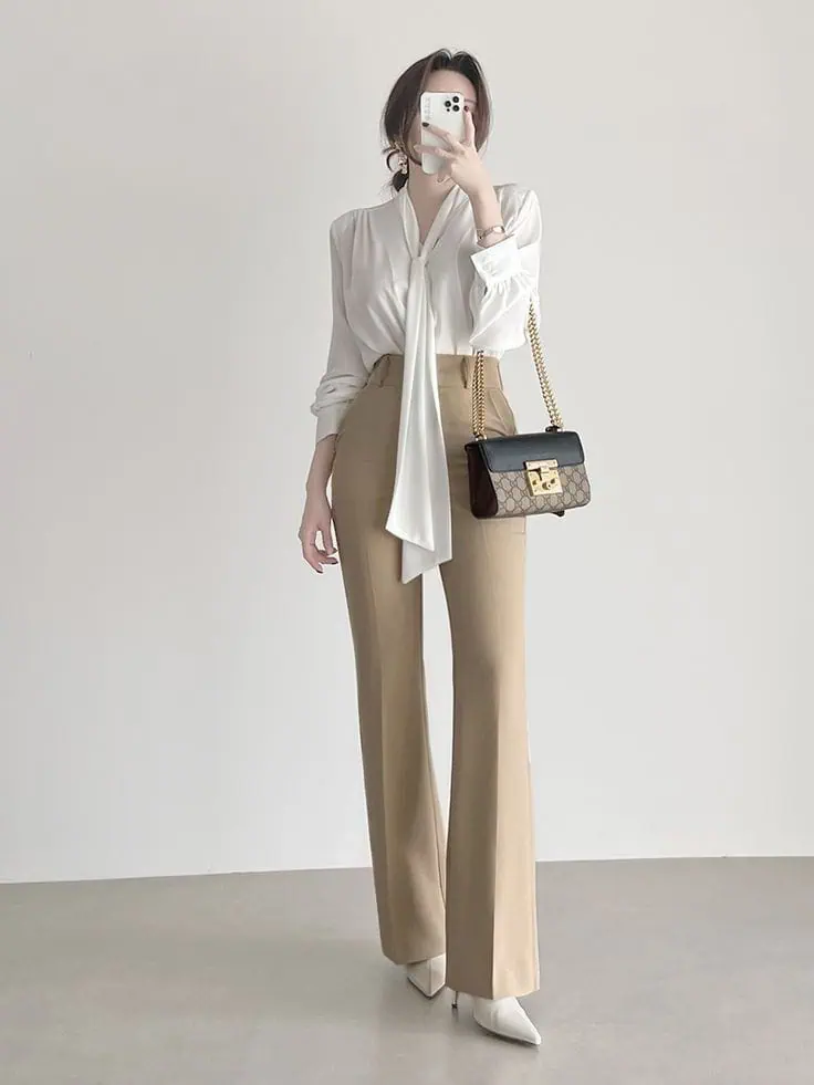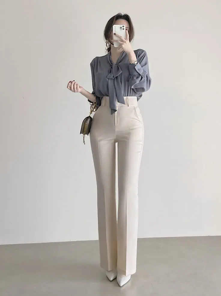 This outfit combines clean shapes with soft colors. A white blouse with a tie detail adds interest while staying simple.
