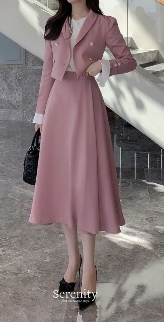 This two-piece outfit offers a soft yet professional look. A cropped jacket with a rounded collar pairs well with a flowing midi skirt.