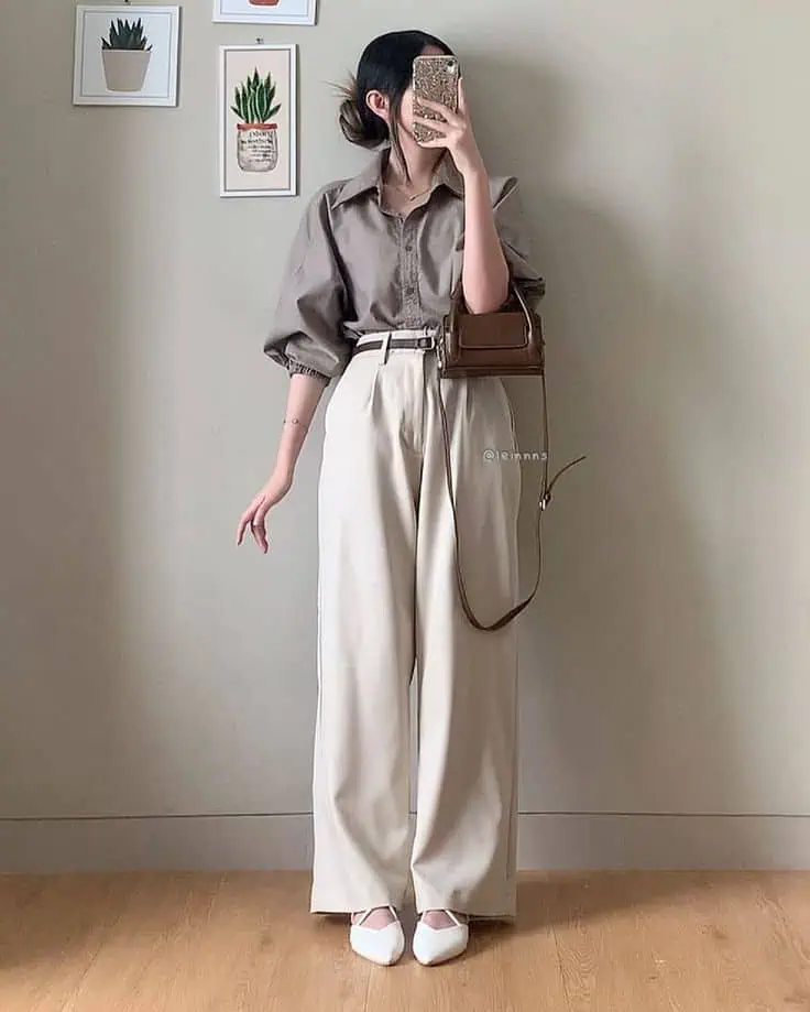 This outfit uses soft, neutral colors for a calm and polished look. A beige blouse with gentle details adds interest without being distracting.