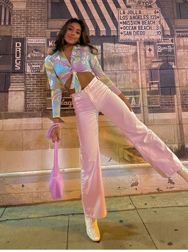 This outfit brings back bold Y2K vibes that feel fun and perfect for winter bar nights. The colorful tie-front crop top with playful patterns looks great with soft pink wide-leg jeans, creating a look that stands out while still feeling balanced.