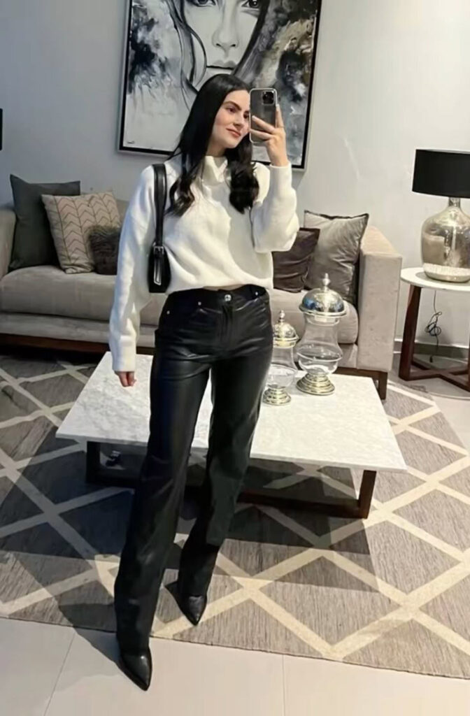 This outfit mixes soft and edgy elements for a strong winter bar look. The cream sweater adds warmth and softness, while black leather pants bring bold contrast.