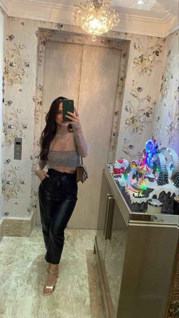 This outfit blends bold and modern elements with ease. The cropped mesh top adds a trendy touch, while black leather pants bring structure and edge.